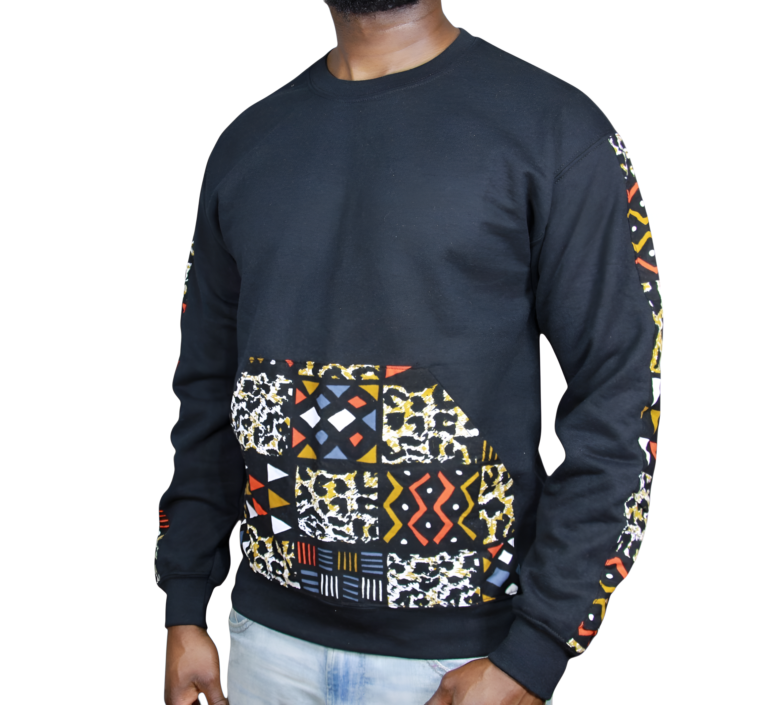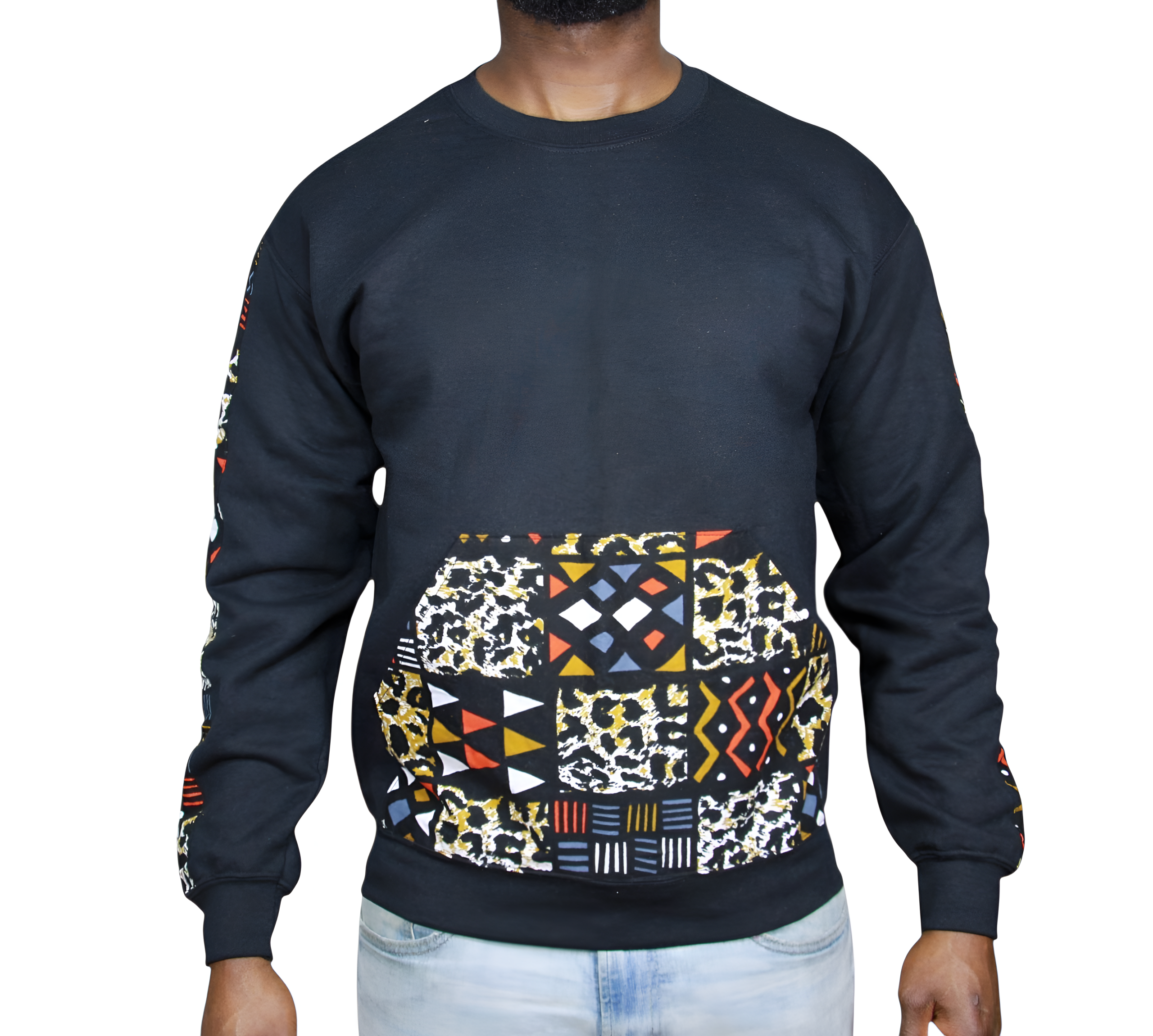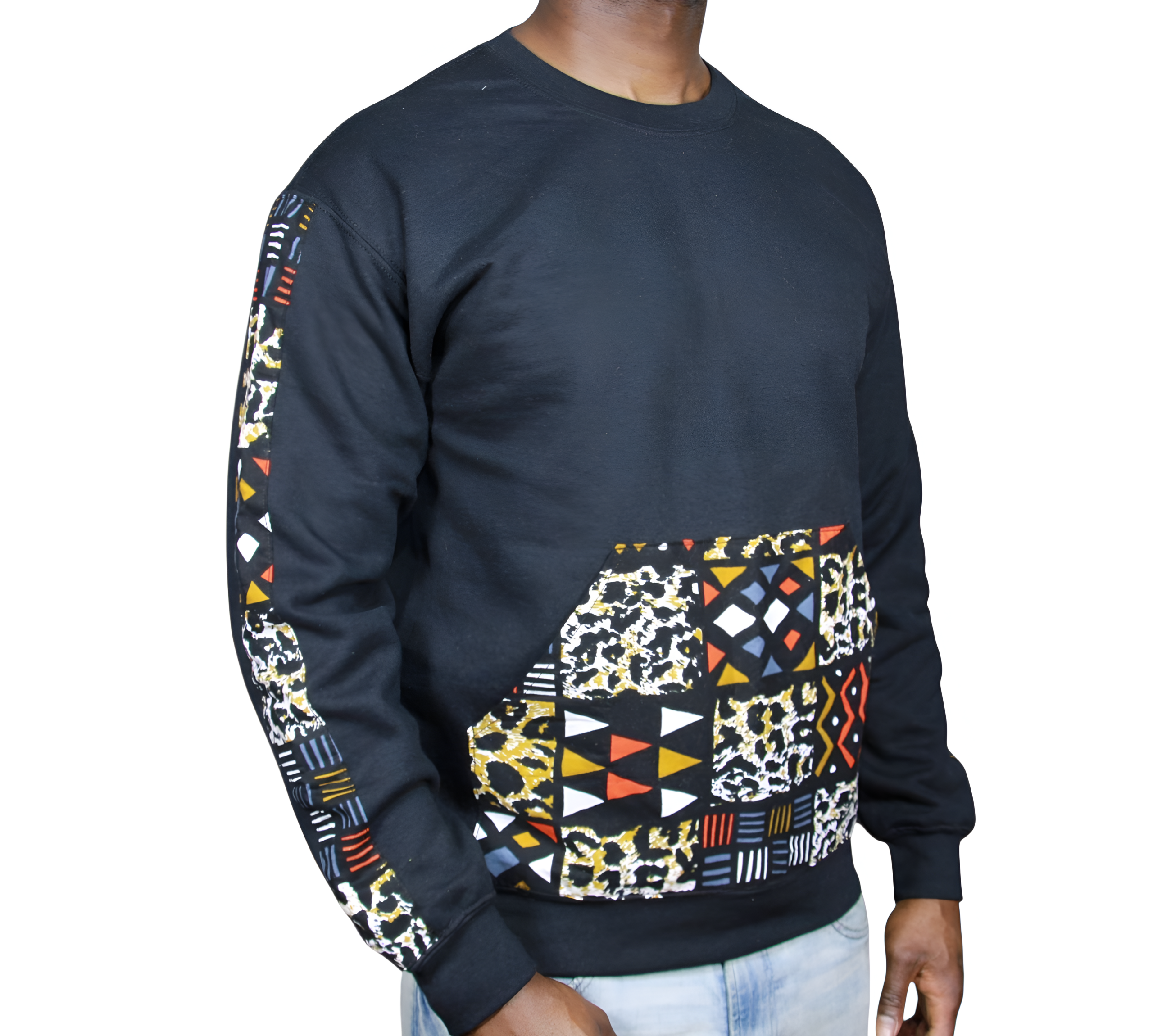 Discover vibrant style with this black crew neck sweater, featuring unique geometric and cheetah print Ankara fabric.